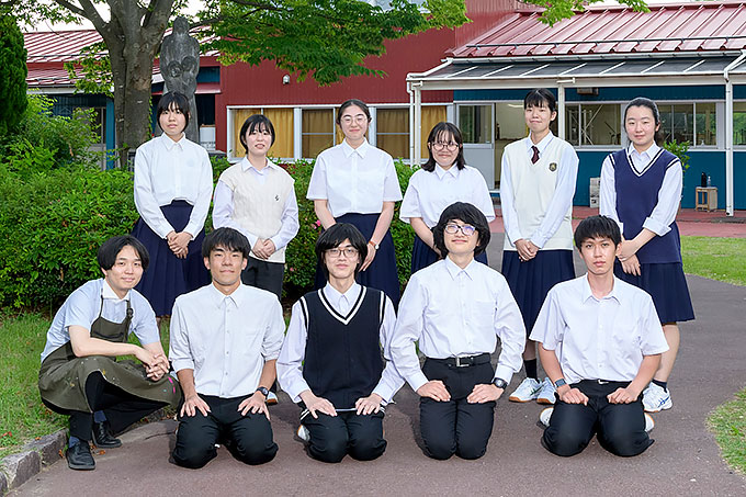 決まった活動内容はなく、初めて作品作りをする人も、趣味として楽しみたい人も、美大合格を目標に頑張りたい人も、自分のペースで制作を進めることができます。普段の活動のほかにも、他の高校と合同の実技講習会に参加したり、展覧会に作品を出したりします。美術部のいろいろな活動を通して、自分にしかできない表現を探してみませんか。